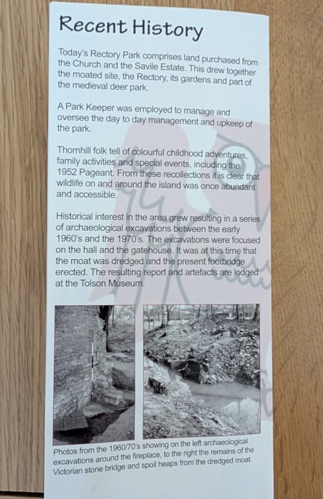 The Thornhill Hall-Discover the Past project has now been completed. We have achieved all our project goals and have the interpretation panel sited by the moat in Rectory Park. We have compiled and had printed our leaflet giving a brief history of the Hall and Moated Site. If you want a copy of this leaflet please contact us using the website contact page and we will send one out.